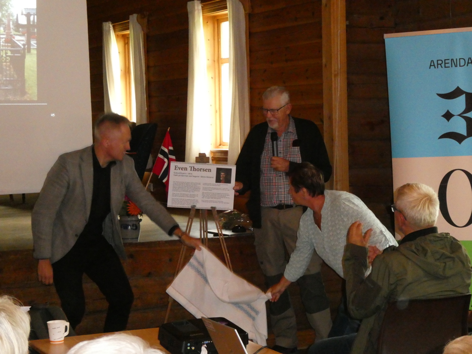 Bård Frydenlund frå Eidsvoll 1814 og Randi Fløystad Vestvik som eig eigedommen på Sagene der Even Thorsen var født, sto for avdukinga av minneplakett om Even Thorsen.