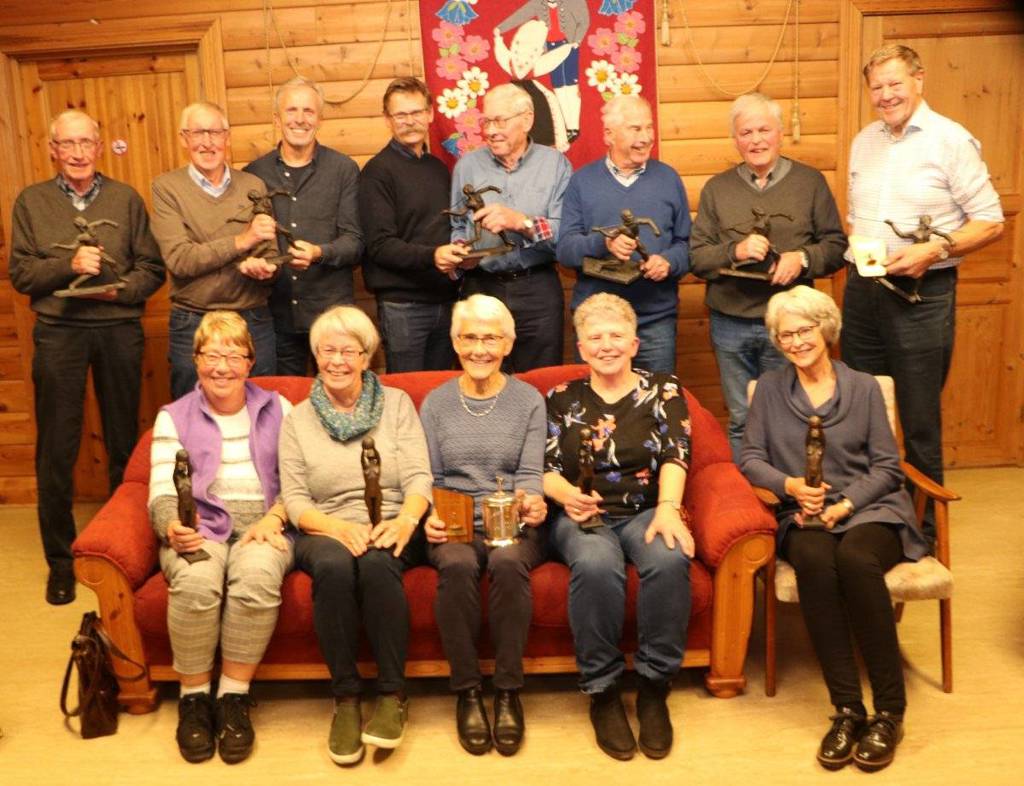 Mange av ded spreke vinnerne av idrettsstatuetten, noen av dei også med krus i tillegg, samla på haustmøtet i historielaget i oktober 2019.