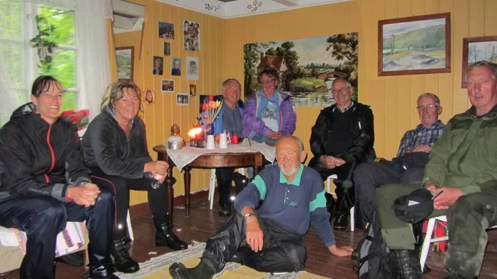 Fra venstre: Lisbeth Hausland, Kari Borås (barnebarn til Sigrid Borås som bodde her ), bak bordet Jan Ommundsen og Elsa Aanonseen,Oddvar Larsen (gift med Reidun, et annet av Sigrids barnebarn), Lars Ledaal, Sigurd Ledaal.