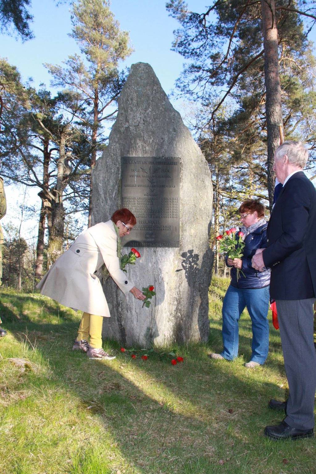 Sigurd Ledaal leste så opp alle navnene på de falne under 1. og 2. verdenskrig (tilsammen 13 navn) og Sonja Noddeland og Elsa Aanonsen la ned en rød rose for hver av de falne, mens våre flaggbærere og representantene fra NIVO ( Norges Veteranforbund for Internasjonale Operasjoner) sto æresvakt på hver sin side med sine flagg