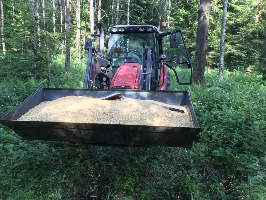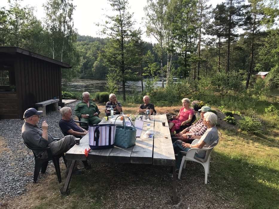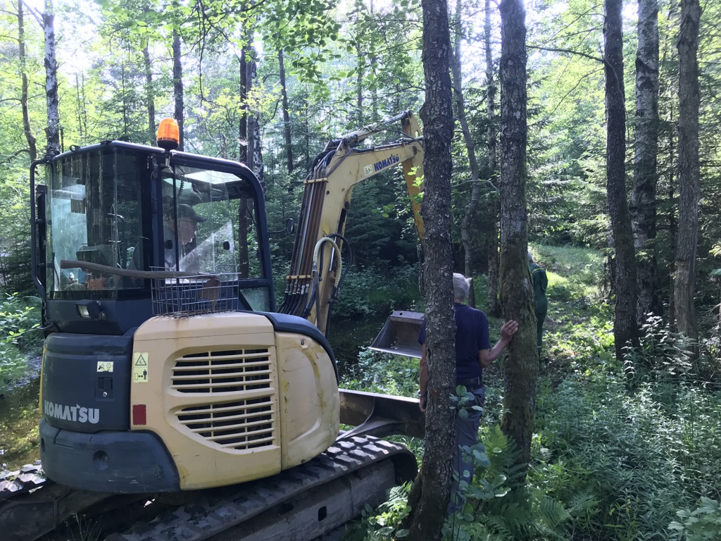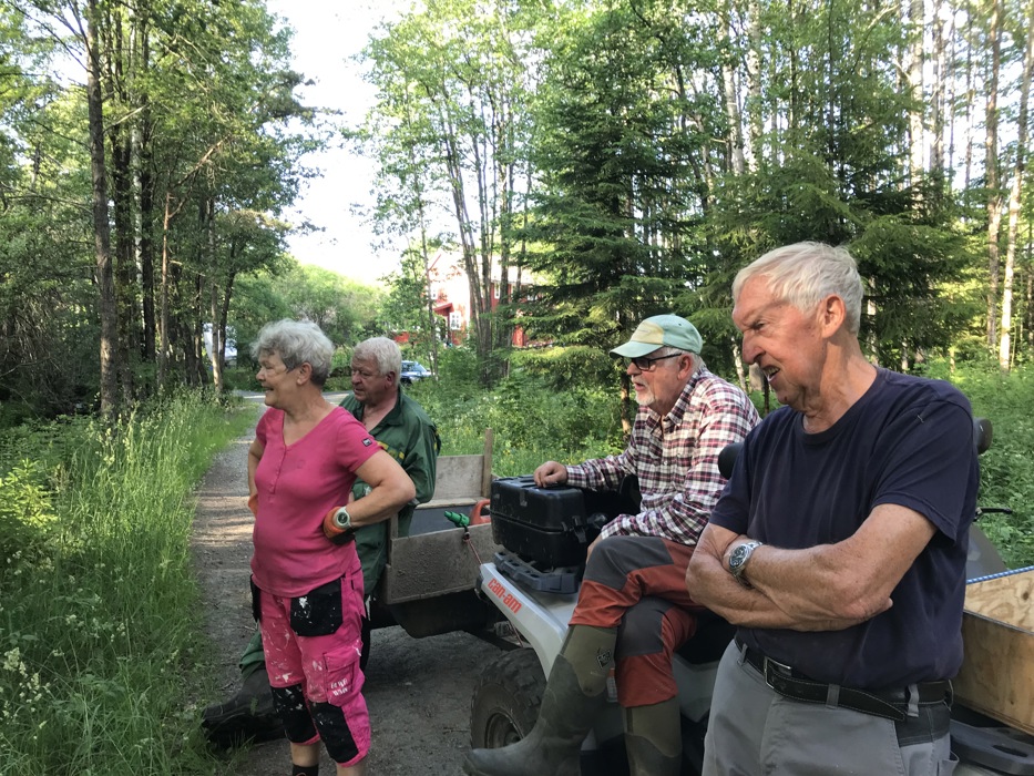 Nils satt i gang så fort at vi ikke fikk tatt bilde av han, Grete og jeg bare måtte «danse» avsted for å rydde kvist. John Bernhard kom med gravemaskin og rør ble lagt ned slik at en kan gå tørrskodd der en før burde ha støvler eller hoppe langt! Med vår arbeidskraft gikk det unna og vi kunne alle kose oss på det idylliske stedet som Tora og Paul har skapt med Kjærrasten!